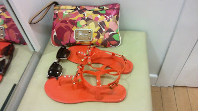 A ver si me podéis ayudar. Me he ido de tiendas, pero concretamente en busca de un vestido. Así que a las 17h he salido de casa, acompañada de mi mami, en busca de "El Vestido", jiji. Y me he puesto esto que veis a la izquierda. Pantalones supercómodos, que ya me habéis visto alguna vez, camiseta de tirantes nueva en color rosa palo y sandalias muy cuquis que me compré ya hará dos veranos. Y claro está, siempre complementada con una de mis pulseras Dmuñeka, que además combina a la perfección con el bolso que he cogido hoy. Y en los pies, unas sandalias, que al igual que el bolso, me enamoré en cuanto se me cruzaron por la vista. Aunque en realidad, casi todo lo que me compro es porque siento un flechazo nada más verlo.
